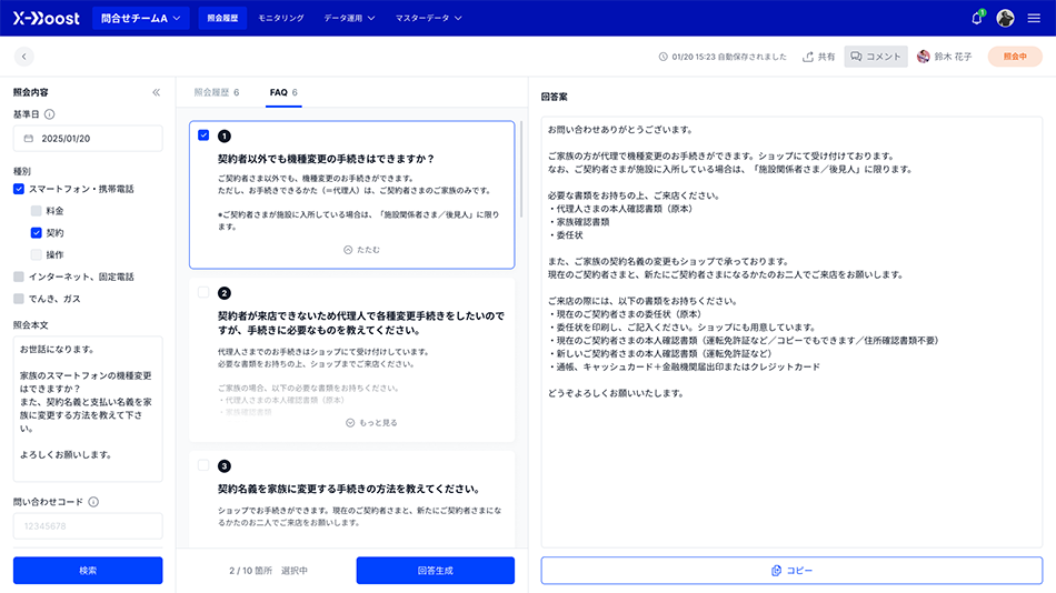 「X-Boost」は、コンタクトセンターやバックオフィスなどにおける問い合わせ対応を担う、さまざまな照会応答業務を支援する生成AI サービスです。オペレーターが問い合わせ内容を入力すると、マニュアルや FAQなどの膨大な社内データからナレッジを検索し、最適な回答案を自動生成して、オペレーターの画面にスピーディーに表示します。導入企業は、業務負荷の軽減、対応スピードや品質の向上、対応内容の均一化などを実現できます。