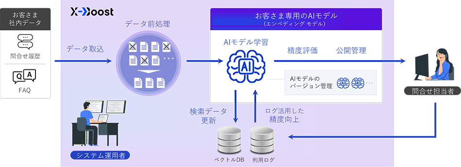 「X-Boost」の特長は、検索拡張生成(RAG)※5やエンベディングモデル※6などにより、高い回答精度を実現する他、LLMOps※7により、導入企業自身がAIの精度を継続的に向上させ、自社の特性に合ったAIに“賢く育てる”ことができる点です。生成AIを導入した企業の中には、自社が保有する社内データを十分に活用できず、AIモデル※8の回答精度が低いまま、業務現場で利用が広がらないケースが散見されます。「X-Boost」は、導入企業が保有するデータの事前学習に加えて、オペレーターなどの現場担当者が実際の業務で利用したログをフィードバックデータとして活用し、フィードバックと改善のサイクルを繰り返すワークフローにより、継続的にAIモデルの精度の向上を行います。また、AIモデルの学習や検索精度が不十分な場合、画面上でより適切な学習データを選択して追加学習を実行することが可能です。その他、回答精度をテスト検証できる機能も備えています。