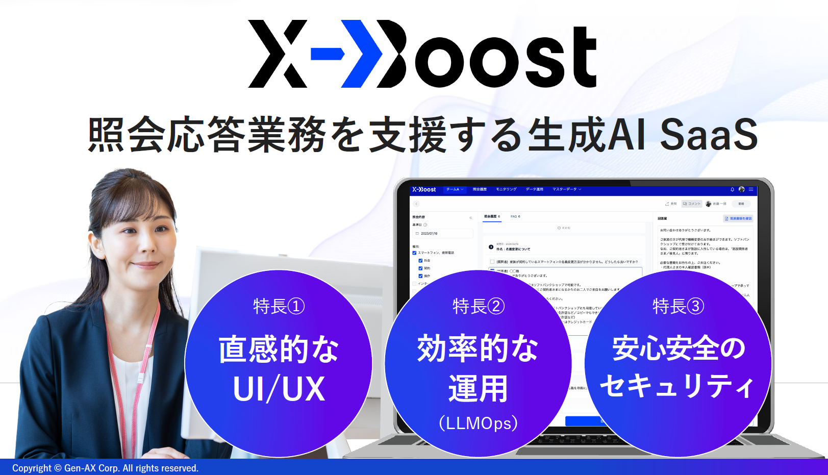 Gen-AXが提供する「X-Boost」は、コンタクトセンターやカスタマーサービス、さらに社内外の複雑な問い合わせ業務に対応するための、業務支援型の生成AIプラットフォームです。